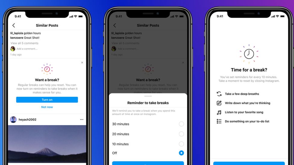"If someone has been scrolling for a certain amount of time, we'll ask them to take a break from Instagram and suggest that they set reminders to take more breaks in the future," Mr Mosseri wrote.